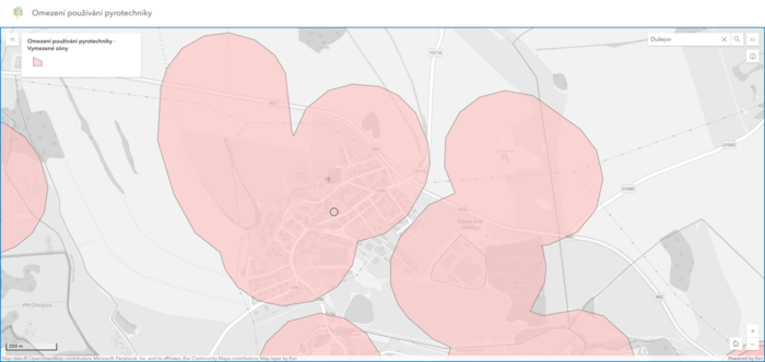 Mapa obsahuje zóny, ve kterých je zakázáno zacházet s pyrotechnickými výrobky s výjimkou kategorie F1 podle § 35b zákona č. 344/2025 Sb., kterým se mění zákon č. 206/2015 Sb., o pyrotechnických výrobcích a zacházení s nimi a o změně některých zákonů (zákon o pyrotechnice), ve znění pozdějších předpisů, a další související zákony.