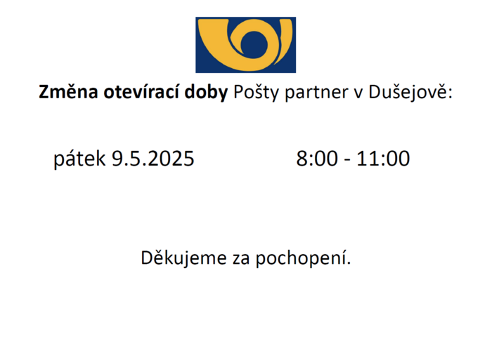 Úvod > Aktuality > Změna otevírací doby Pošty Partner Dušejov 9. května 2025