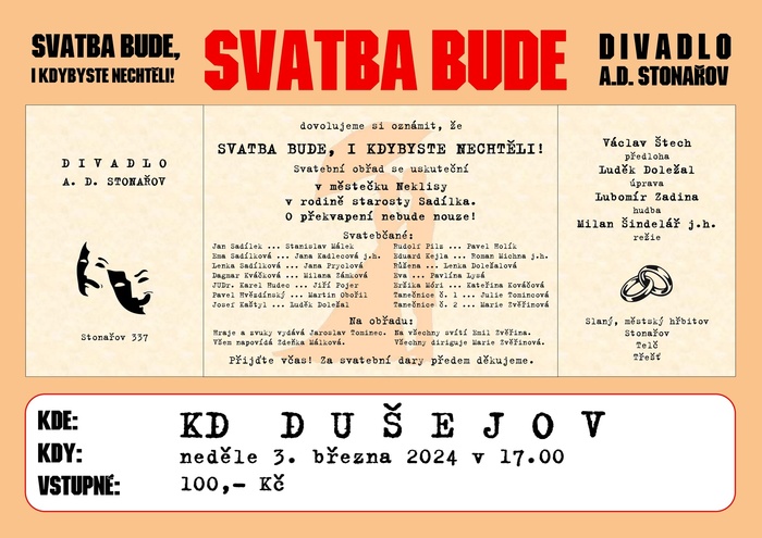 Úvod > O obci > Fotogalerie > Divadelní představení Divadla A.D. Stonařov - Svatba bude, i kdybyste nechtěli
